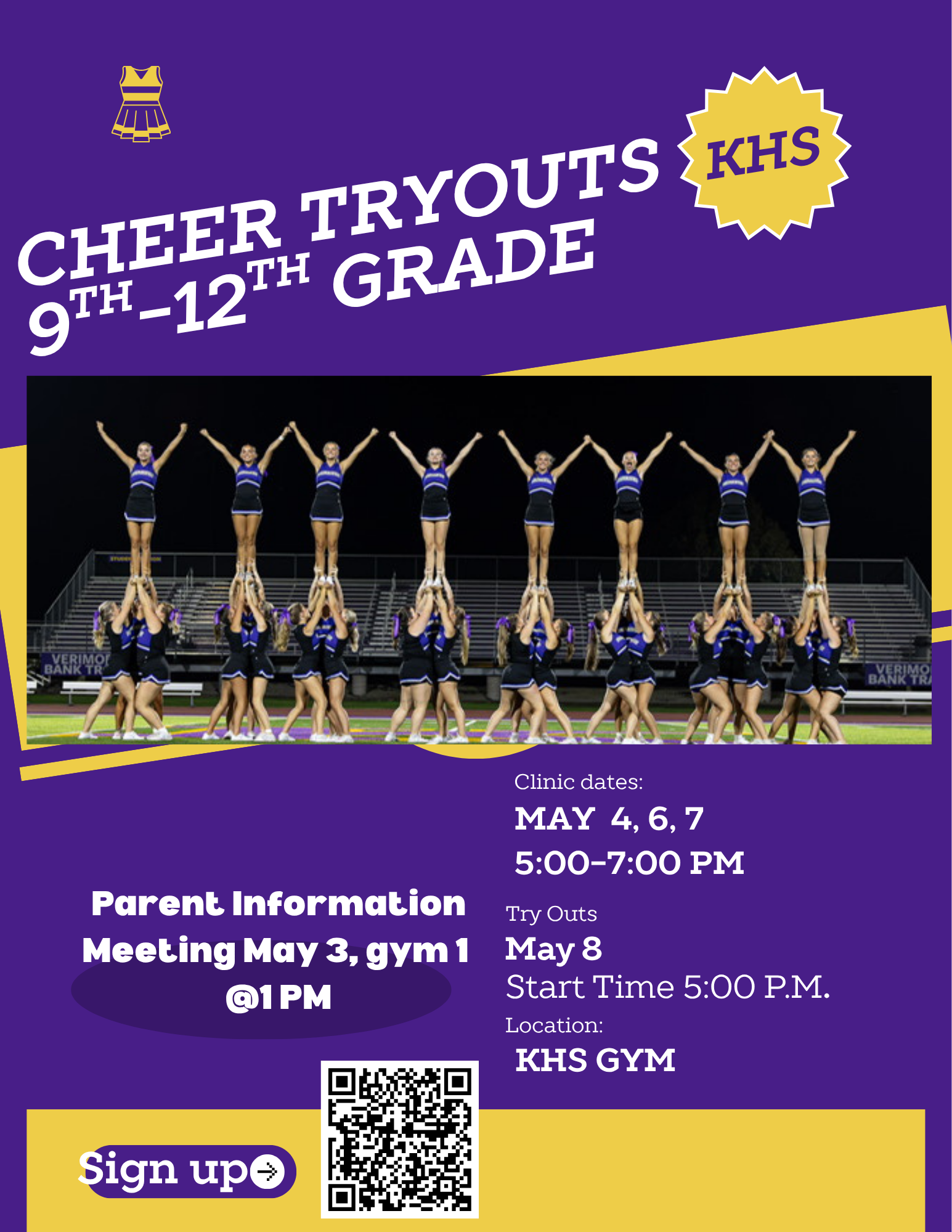 A parent information meeting will be held at 1 p.m. on Sunday, May 3, in Gym 1. Tryout clinics are scheduled for May 4, May 6 and May 7 from 5 to 7 p.m. in the KHS gym. Official tryouts will be held on May 8, beginning at 5 p.m.